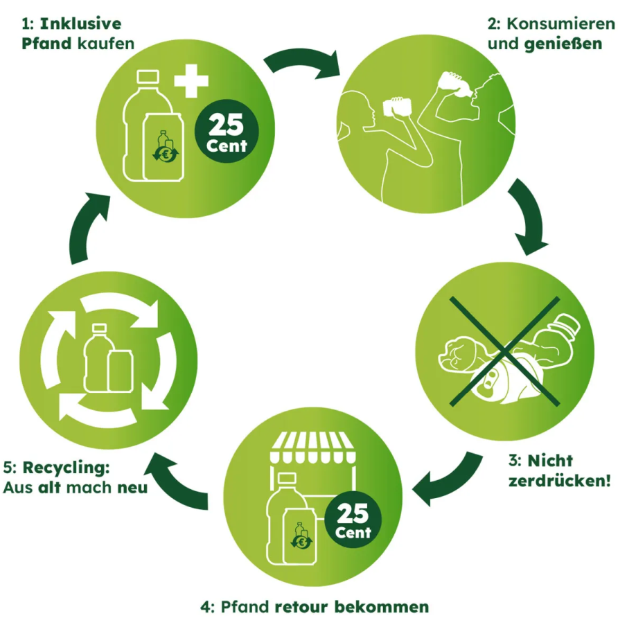 Ab dem 1. Januar 2025 gibt es in Österreich ein Pfandsystem für Plastikflaschen und Getränkedosen. Das bedeutet, dass man beim Kauf einen kleinen Betrag zahlt, den man zurückbekommt, wenn man die Flasche oder Dose wieder abgibt. Das hilft, mehr Flaschen und Dosen zu recyceln und die Umwelt sauberer zu halten. So werden weniger Abfälle gemacht und die Ressourcen besser genutzt. Weitere Infos gibt es hier.